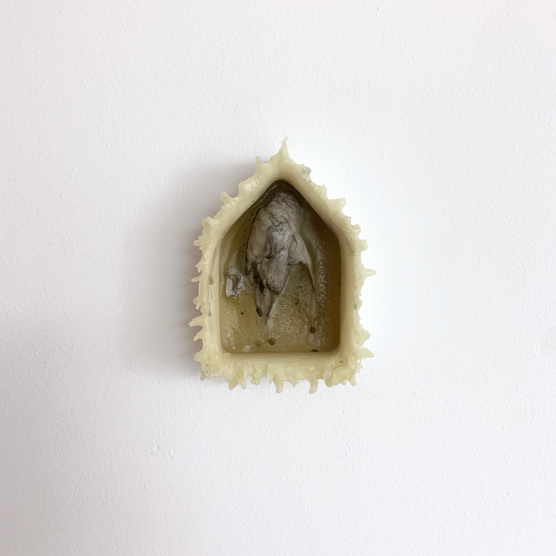 Birdhouse, 17cm x 12cm, painted wood, wax and plaster cast of a dead bird, 2023