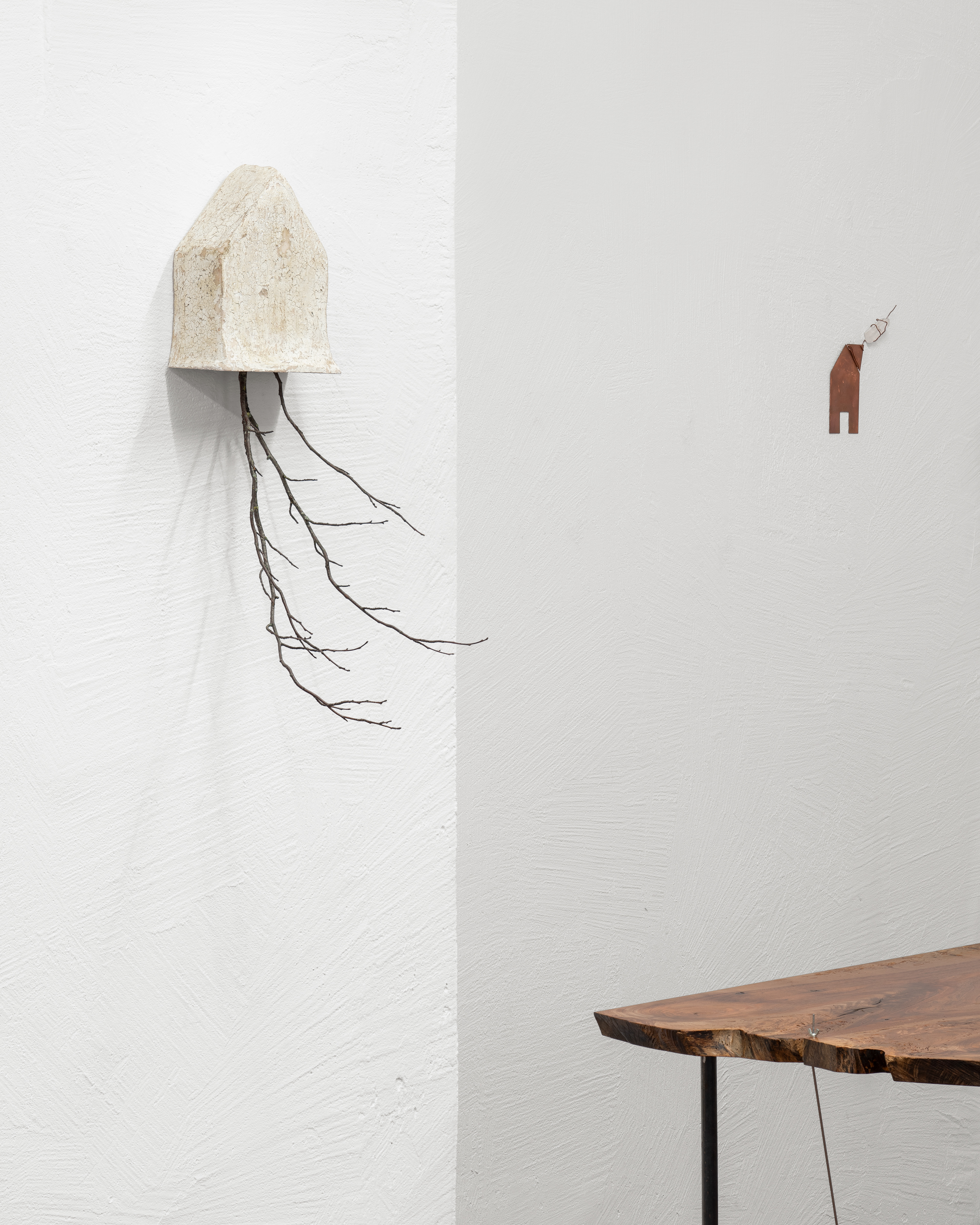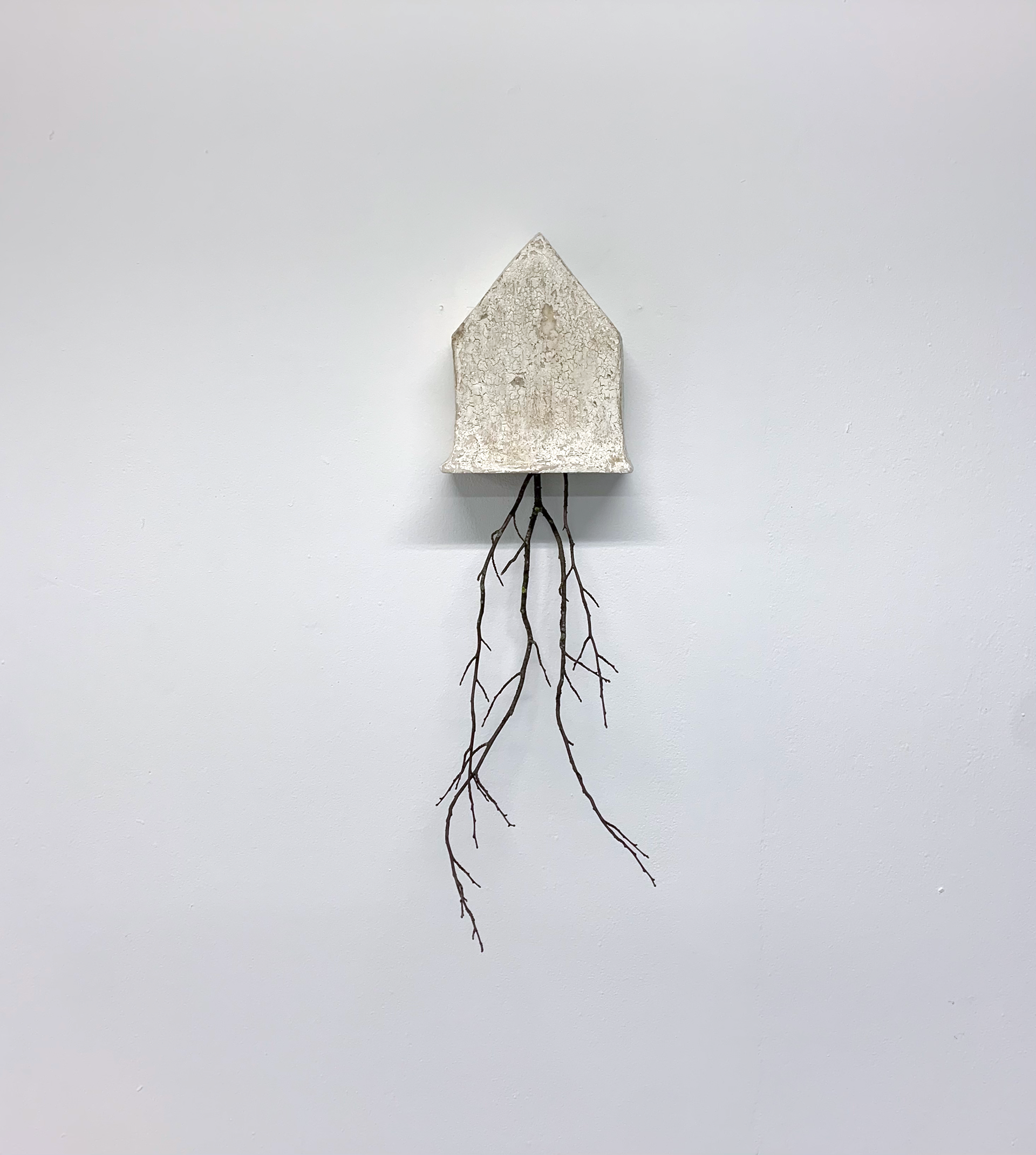 My limbs stretch out to meet You, 70cm x 21cm x 21cm, Painted plaster and wax, wooden branches, 2023