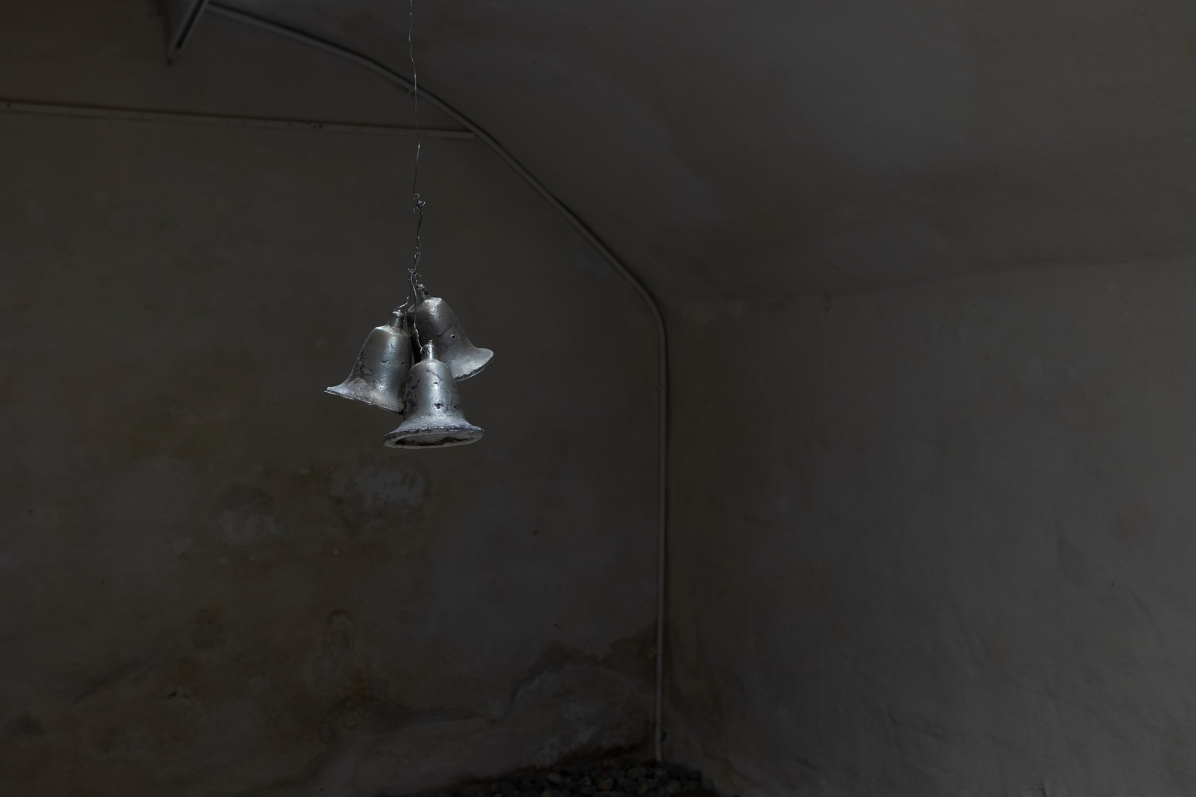Untitled, 200cm x 90cm x 300cm, cast tin, steel wire, glass, mattress, 2024